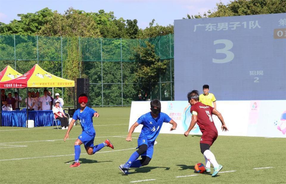 盲人足球项目竞赛中每队上场5人。除守门员外,其余4名球员的视力伤残程度,需要达到B1级,即完全丧失视力且无光感。球员还需佩戴符合竞赛规程的眼罩参赛,竞赛使用的球内有发声装置,通常为铃铛,球在滚动过程中持续发出清脆声音。球员通过聆听球的声音来判断球的位置、运动方向和速度,从而完成传球、带球、射门等技术动作。